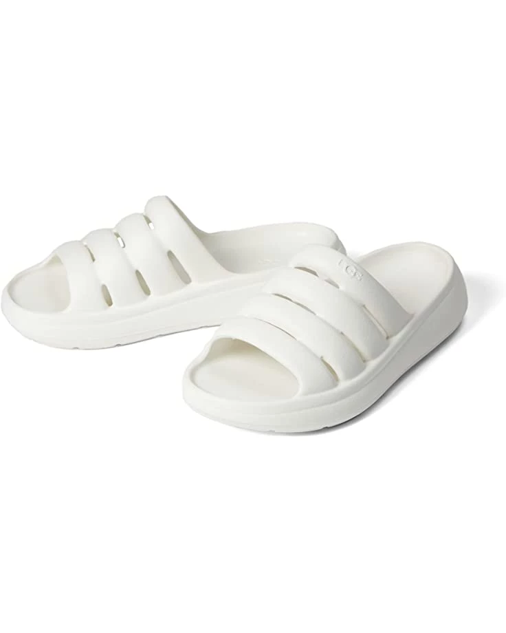 - The UGG® Sport Yeah SO flat sandals look chic with their multicolored branding detail on the heel strap and offer versatility with their water-resistant construction.